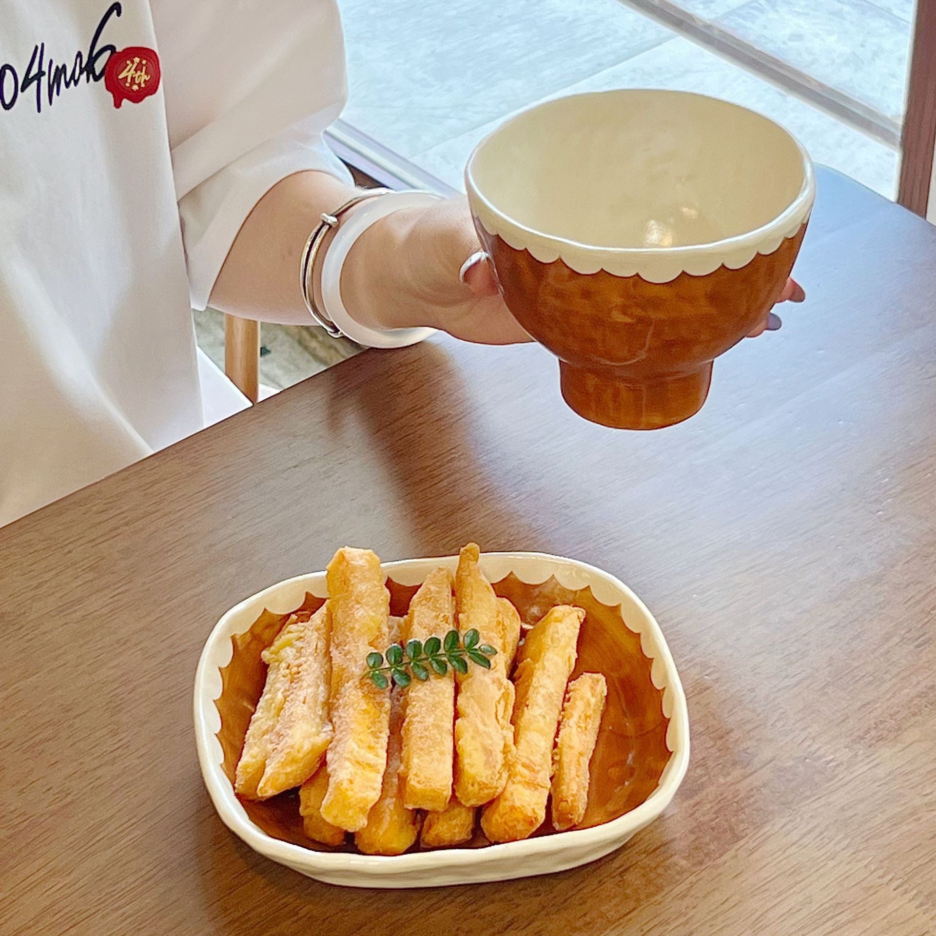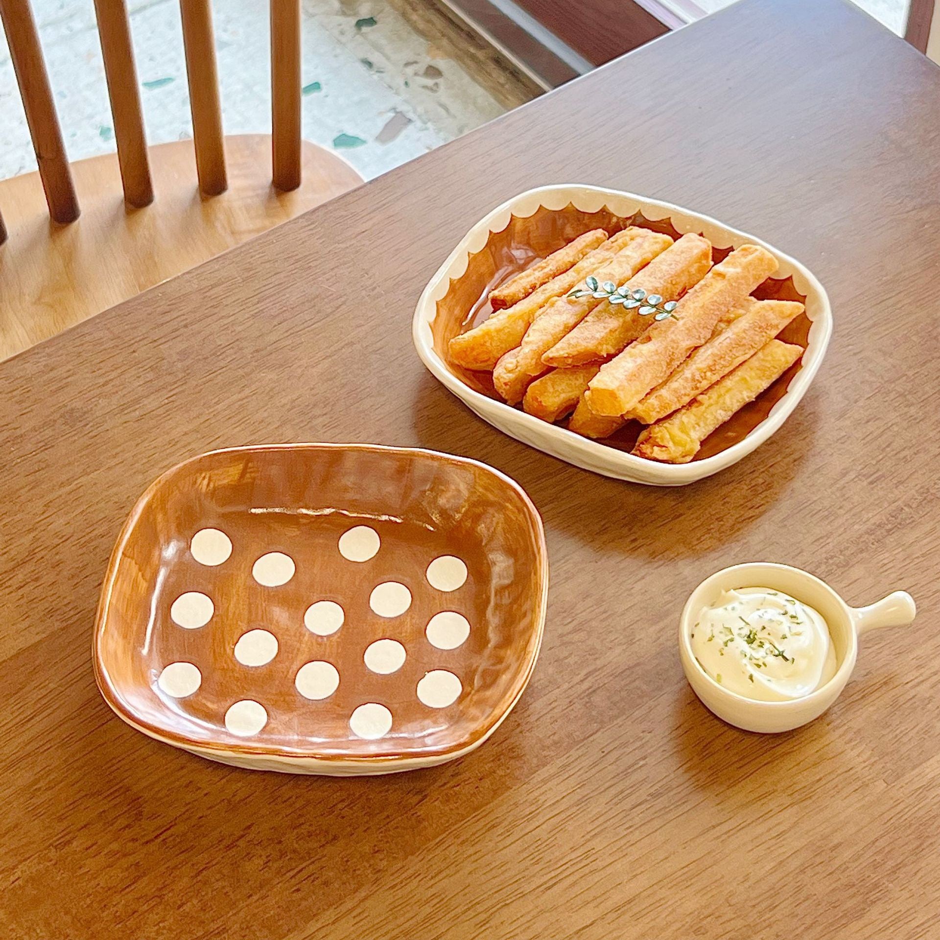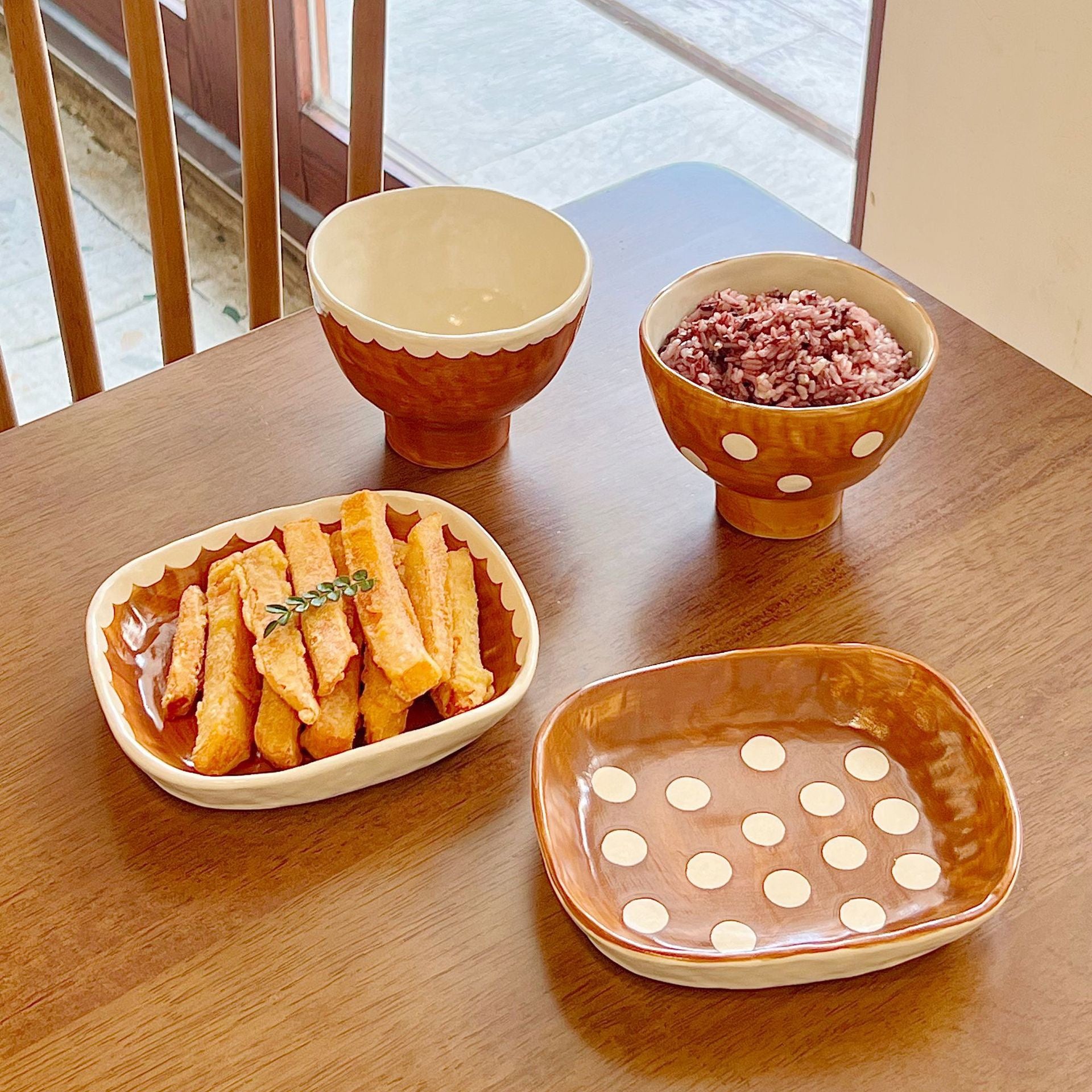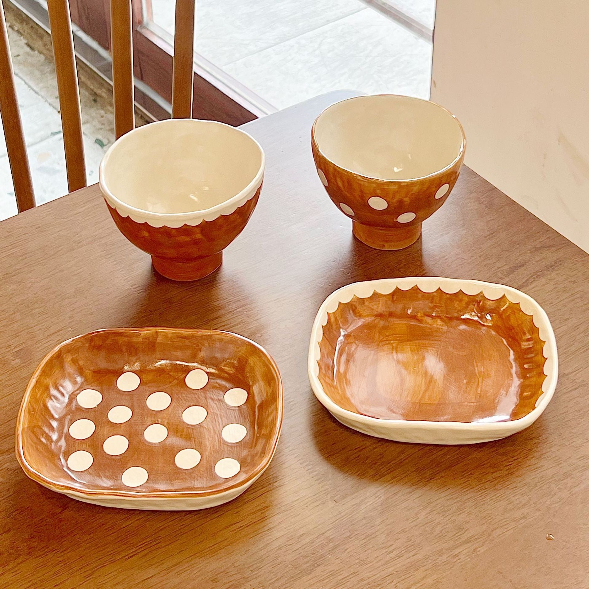 Subtle polka dot details and gently scalloped edges add quiet character, while the glossy hand-glazed finish creates natural variations in tone and texture. Each piece feels grounded, warm, and made for everyday use.