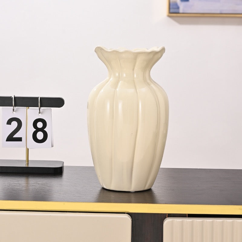 Elegant, timeless and delicately fluted—this ivory ceramic vase adds soft vintage charm to any space. Whether displayed on its own or filled with fresh blooms, it's a beautiful piece for your dining table, shelf or desk.